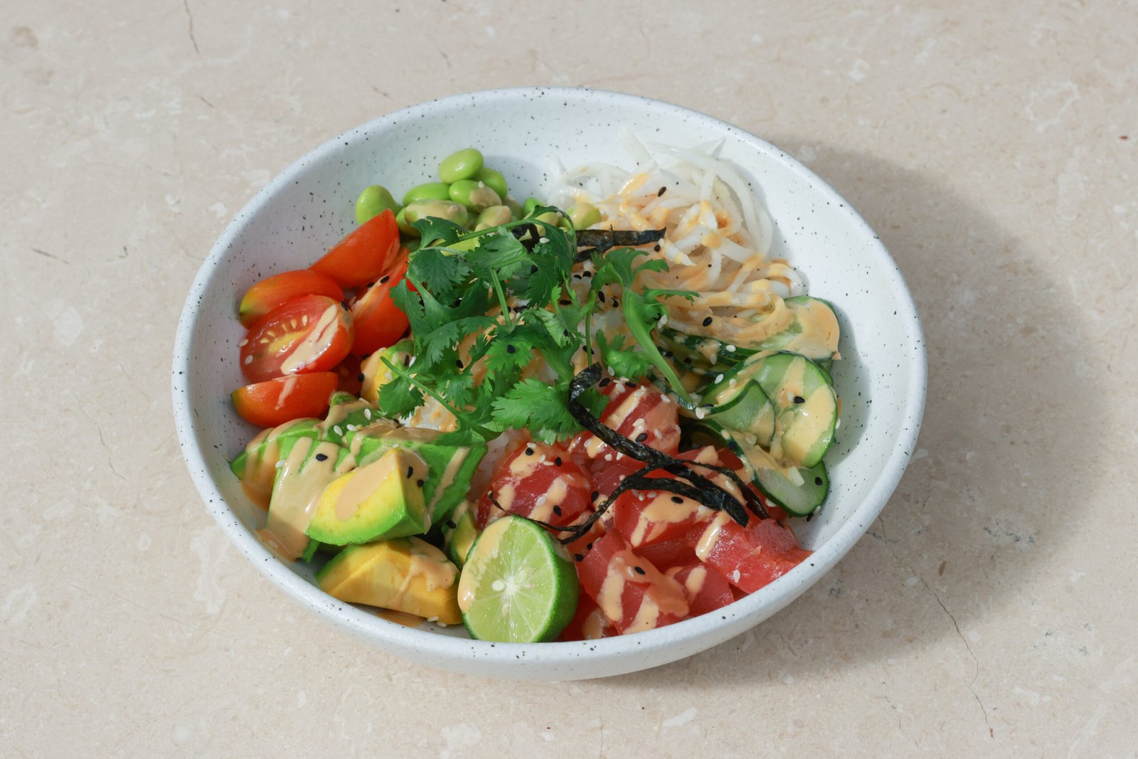 white rice, edamame, avocado, cucumber, cherry tomatoes, daikon radish